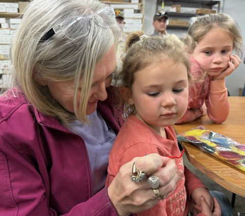 2. Karen Smith shows granddaughters Sydney and Madison a new trout fly at