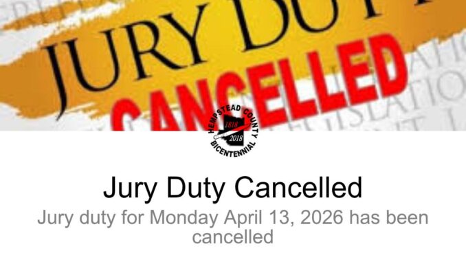 Hempstead County jury duty canceled April 10, 2026 Dale Gathright, Jr. Featured, Hempstead County News, News 0 Hempstead County jury duty canceled Jury duty for Monday April 13, 2026, has been cancelled.