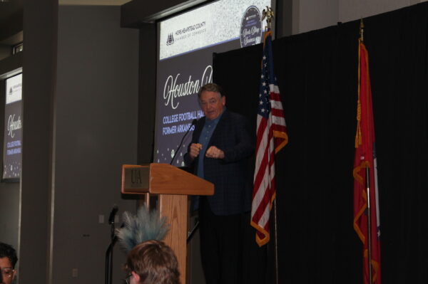 The featured guest speaker, Former Arkansas Razorback Football Coach Houston Dale Nutt, was introduced, but not before the entire crowd was led in a loud rendition of “Calling the Hogs”, which got the everyone in the proper mood for his entertaining speech. He mentioned several former Razorback players who competed under him who were also in attendance including Hope’s own David Johnson. Over the course of his career, Houston Nutt coached 20 All-Americans, and 175 All-SEC selections. Nutt also ranks as the second-winningest coach in the University of Arkansas, behind only the legendary Frank Broyles.