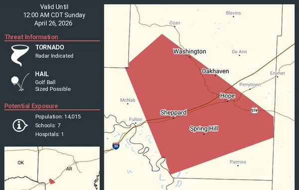 tornado was located near Washington, or 11 miles northwest of Hope,